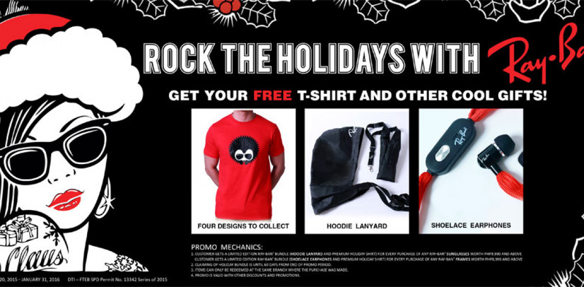 Customer gets a limited edition Ray-Ban® Bundle (Hoodie Lanyard and Premium Holiday Shirt) for every purchase of any Ray-Ban® Sunglasses worth PHP9,990 and above.Customer gets a limited edition Ray-Ban® Bundle (Shoelace Earphones and Premium Holiday Shirt) For every purchase of any Ray-Ban® Frames worth PHP8,990 and above.